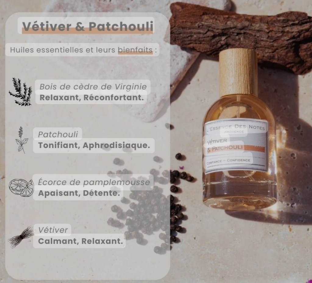 Accords boisés et terreux de vétiver, patchouli et bergamote.